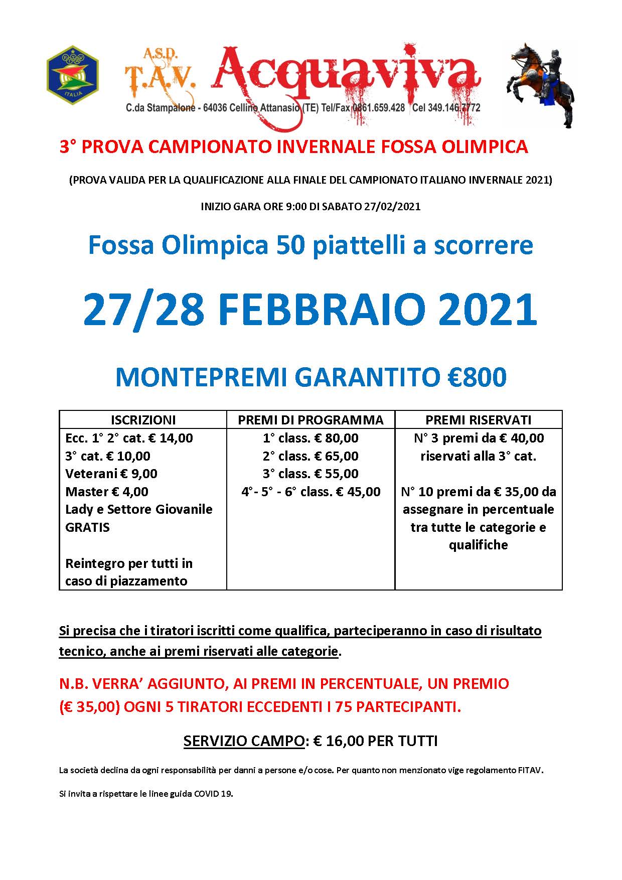 Si è tenuta nelle due giornate di sabato 27 e domenica 28 febbraio 2021 la 3° PROVA DEL CAMPIONATO INVERNALE DI FOSSA OLIMPICA. La prova su 50 piattelli "a scorrere", valida per la qualificazione alla finale del campionato Italiano Invernale FITAV 2021, ha previsto il montepremi garantito di € 800,00.